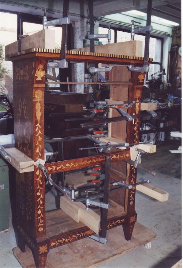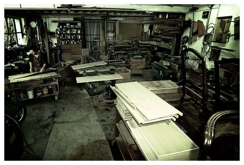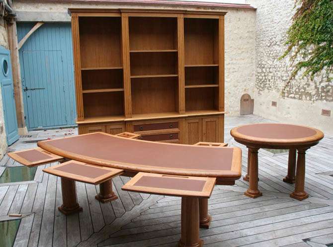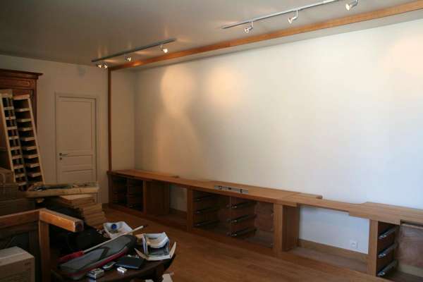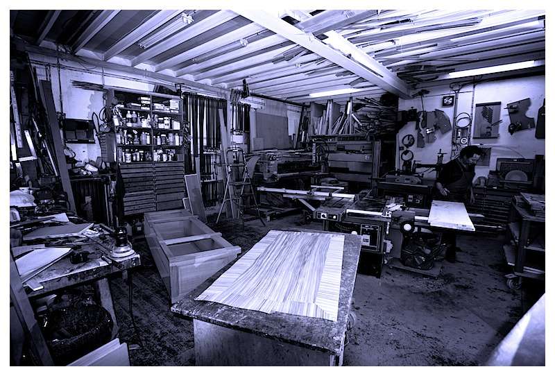 Installé en 1987 dans son atelier d’Amponville au sud de Fontainebleau, il conçoit, crée, fabrique et restaure des meubles et objets. Il travaille les essences de bois les plus variées et une vaste palette de matières, de textures et de couleurs. Sous ses doigts et ses outils, les pièces de bois deviennent bibliothèques, commodes, boiseries, bureaux, billards, cadres ou coffrets précieux...